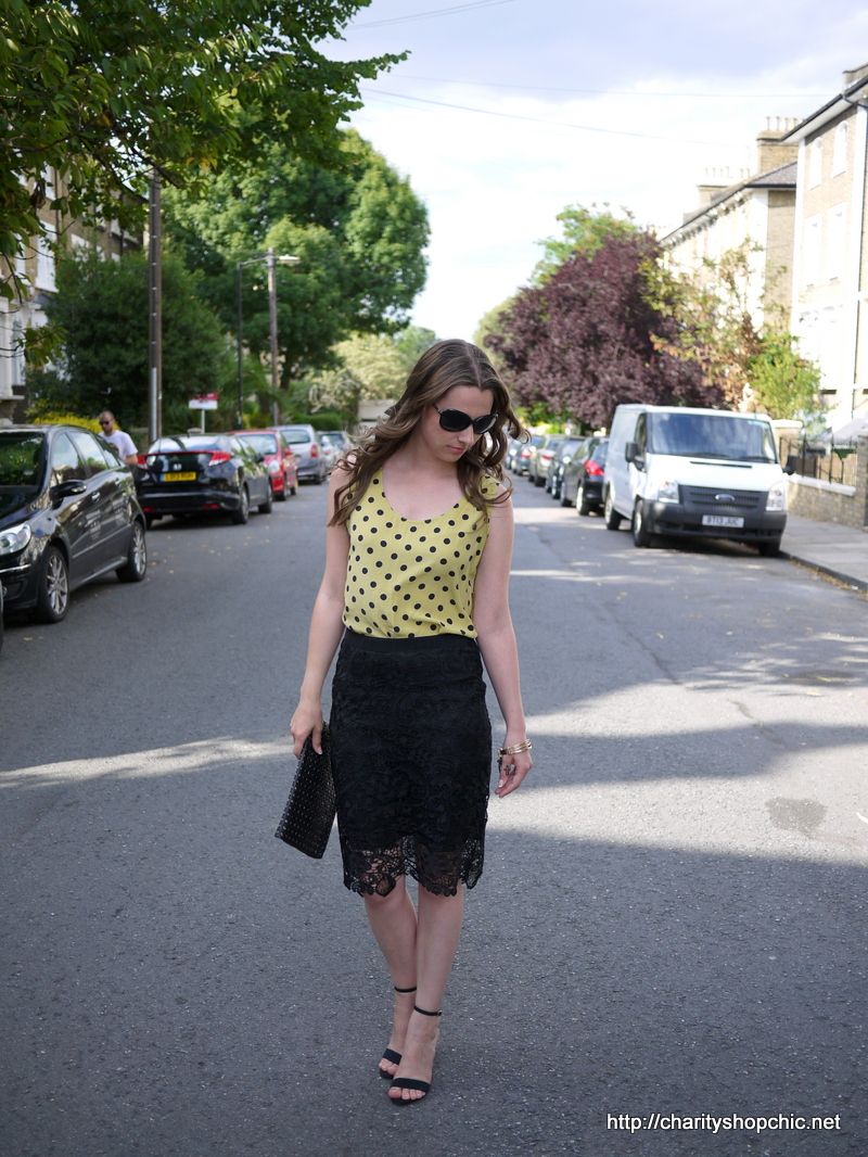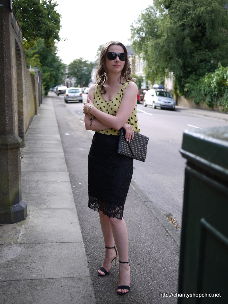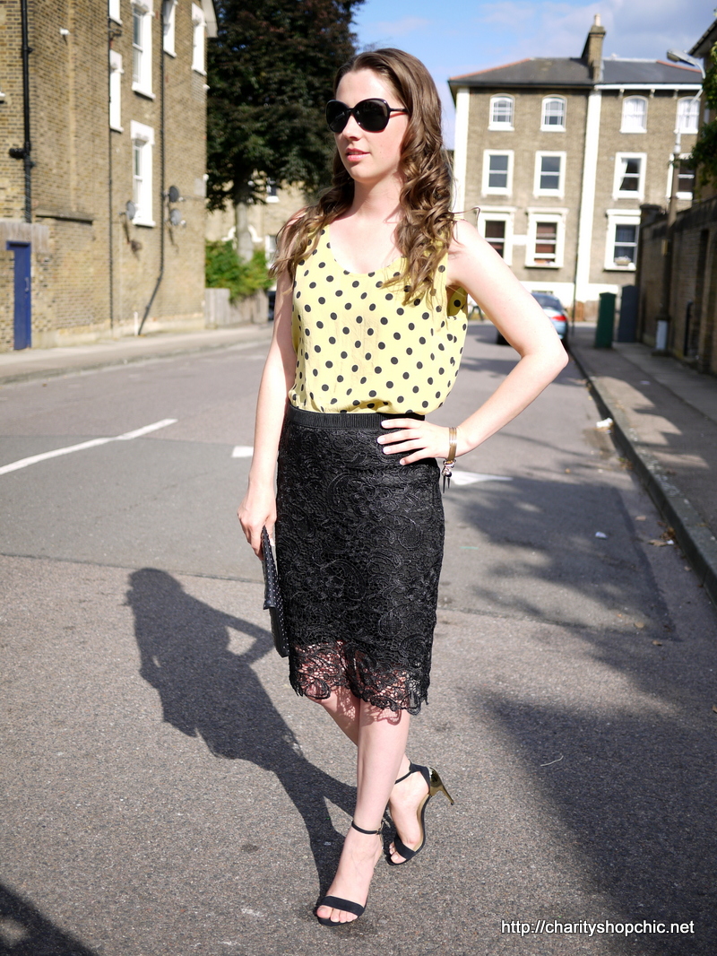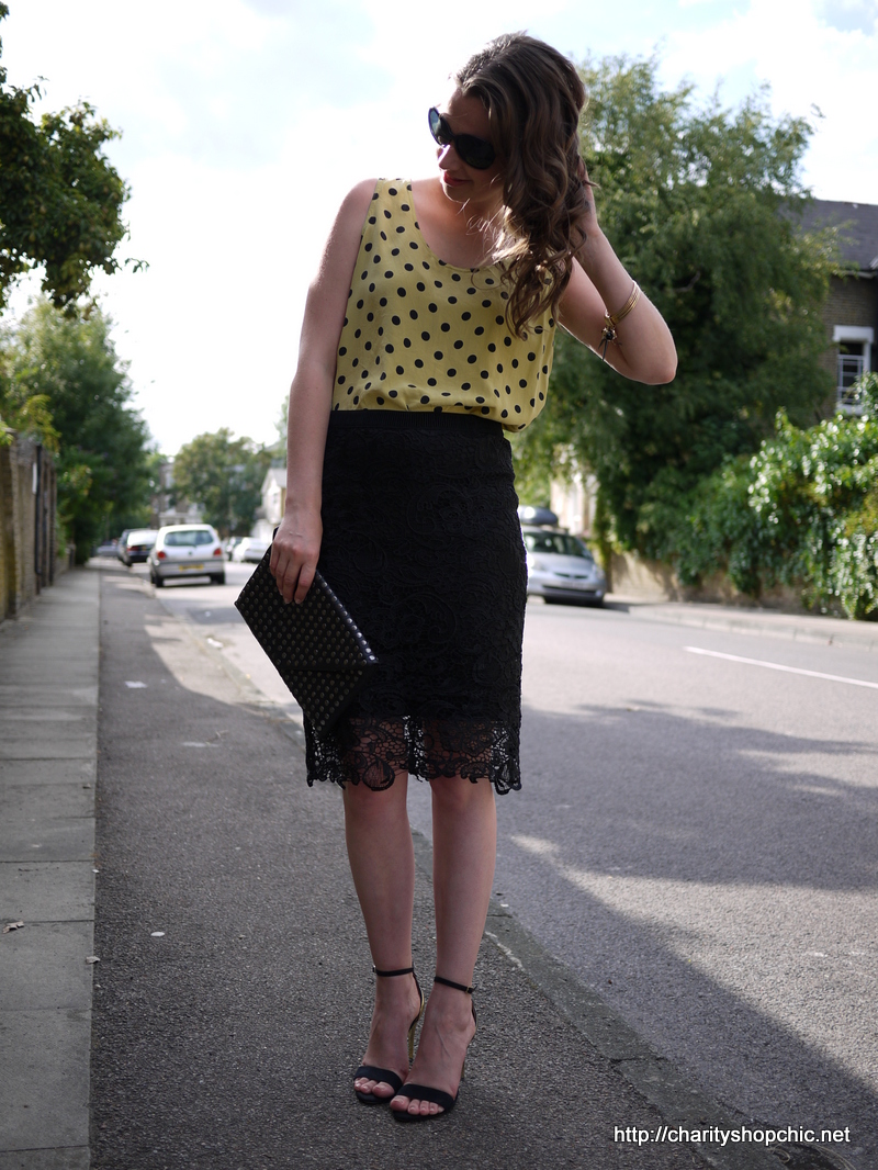I’ve previously found this colour yellow rather difficult to wear, but I’m giving it a good go, pairing it with a black skirt and gold, black and grey accessories.
