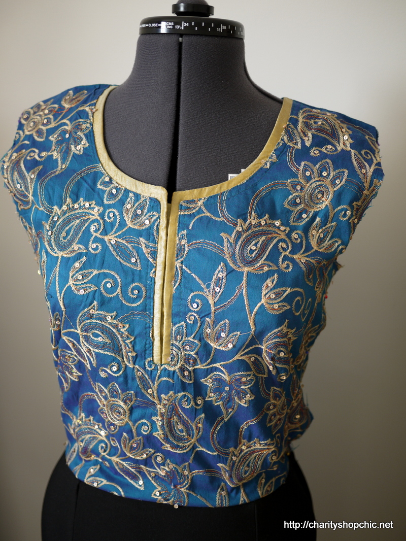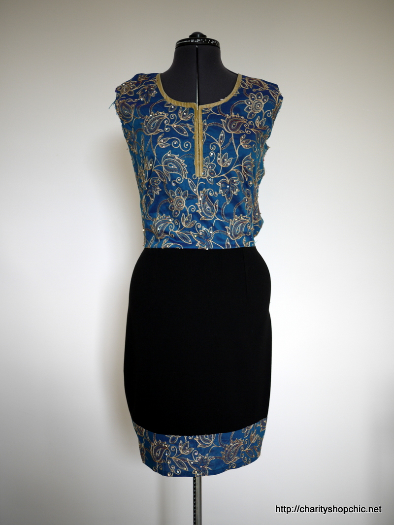 I bought this tunic top in the Human Relief Foundation shop in New Cross, and if I remember correctly, I only paid £2 for it. It’s a stunning deep teal blue silk with gold trim, heavy embroidery and rather glamorous gold sequins! It looks like it could have been the top half of a shalwar kameez, sadly though there were no matching trousers to be had.