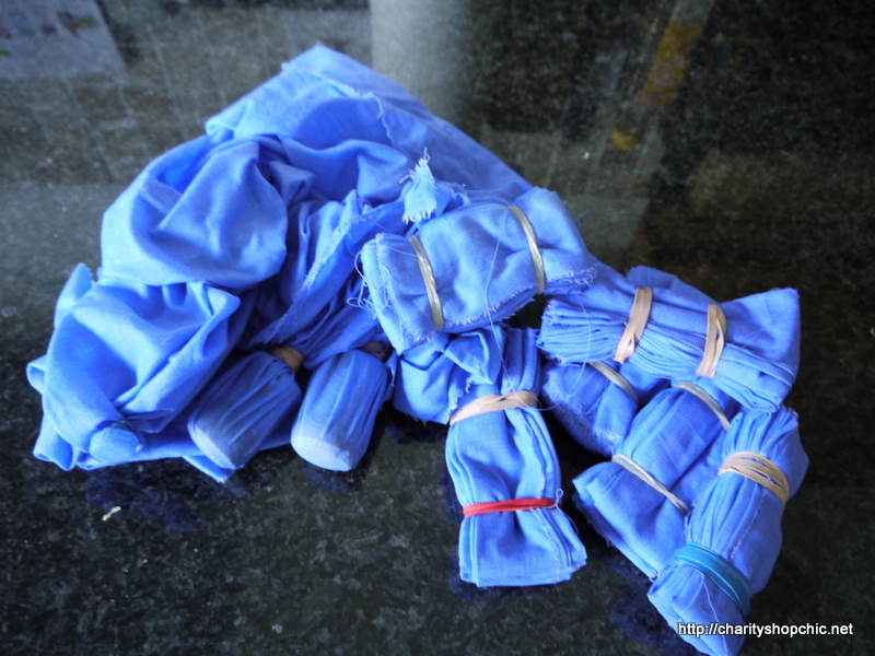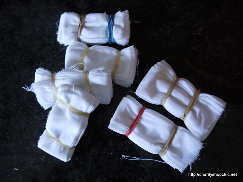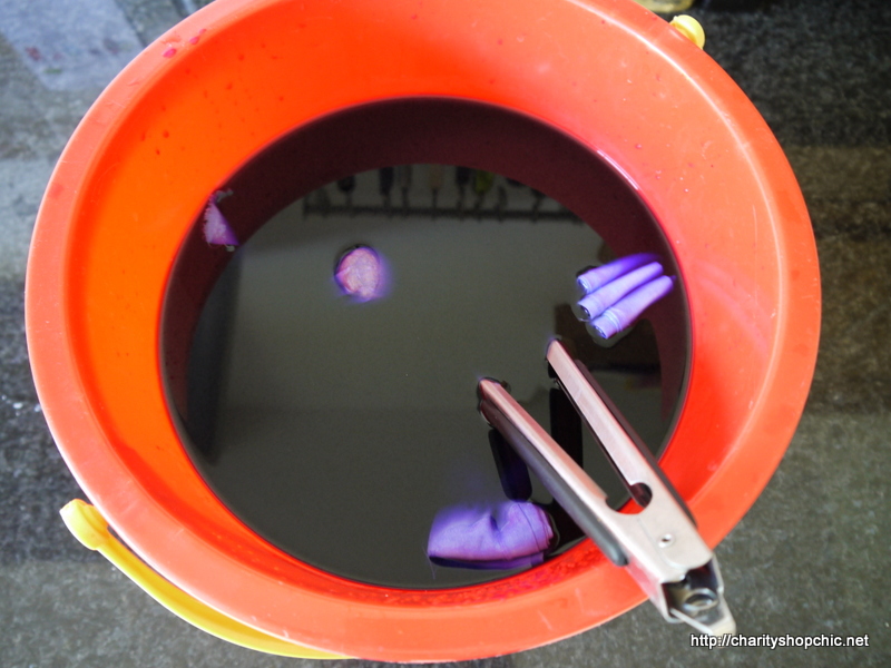 Following the directions on the dye packet, I dissolved it in warm water and added the salt, popped in my parcels and left them there, stirring occasionally, for about an hour. WEAR GLOVES AND AN APRON if you try this, folks!