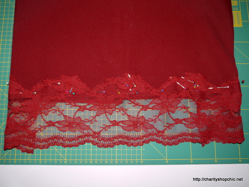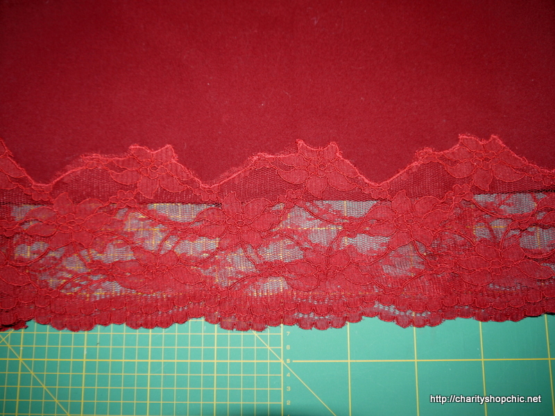 To add some visual interest, I am using red lace fabric. I searched high and low for some red lace trim but couldn’t find any, so I’m making my own. I cut the scalloped edge from the fabric, following the lines of the pattern, and pinned it to my skirt.