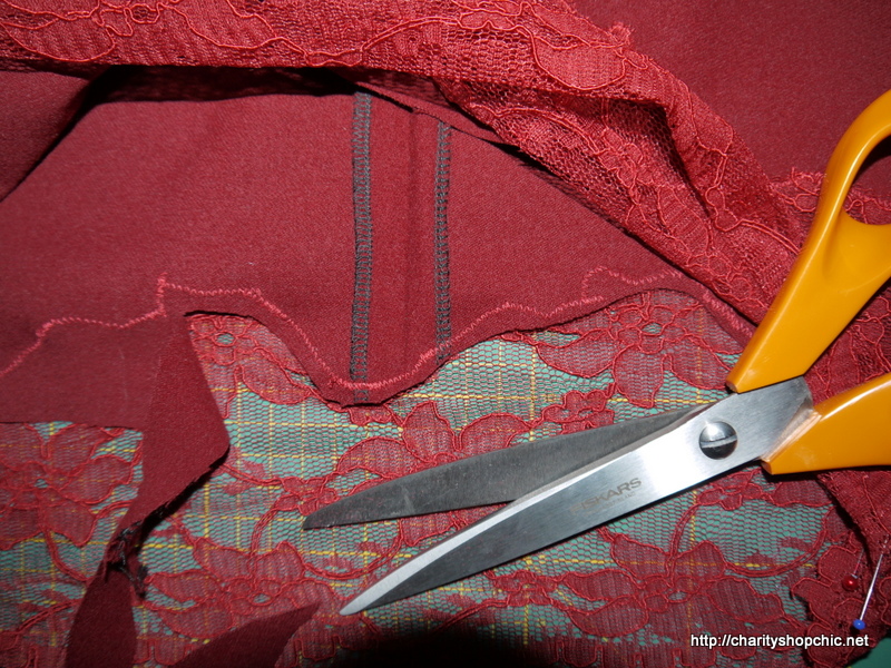 You can then cut off the hem of the skirt as close as you dare to the zig zags, being very careful not to cut the lace.