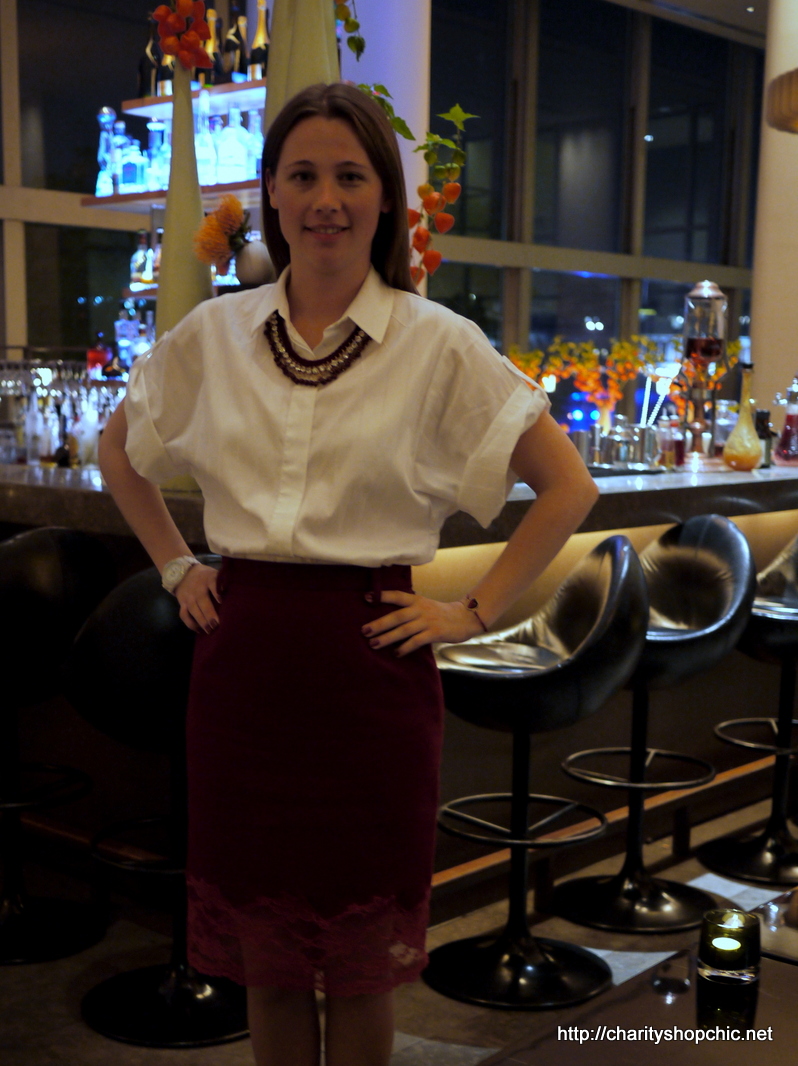 This new red skirt with added visual interest was perfect for a night out on the South Bank. I paired it with a white shirt, dark red and diamante necklace, red gem and string bracelet, fierce dark red nails (this colour is Essie ‘Fishnet Stockings’ in case you’re interested), and newly-acquired dark red patent shoes. I think this one will be getting a lot of wear over the winter.