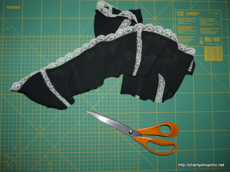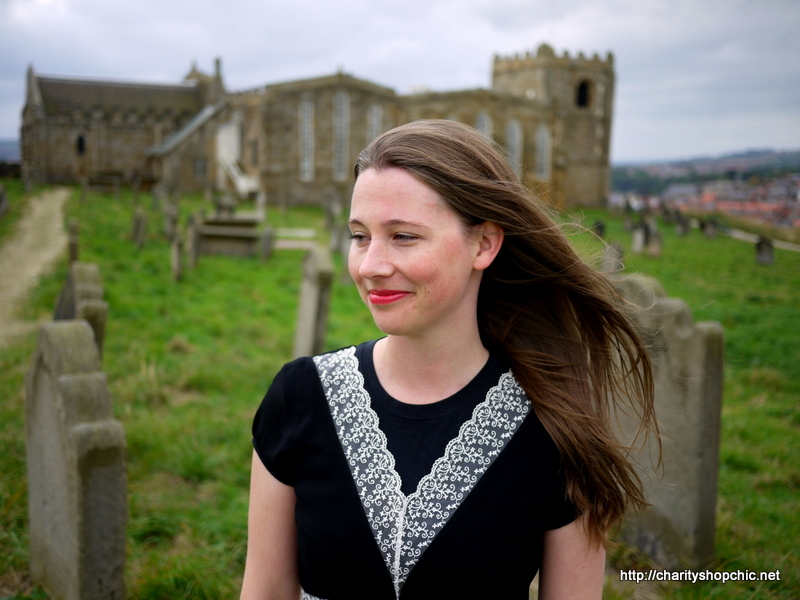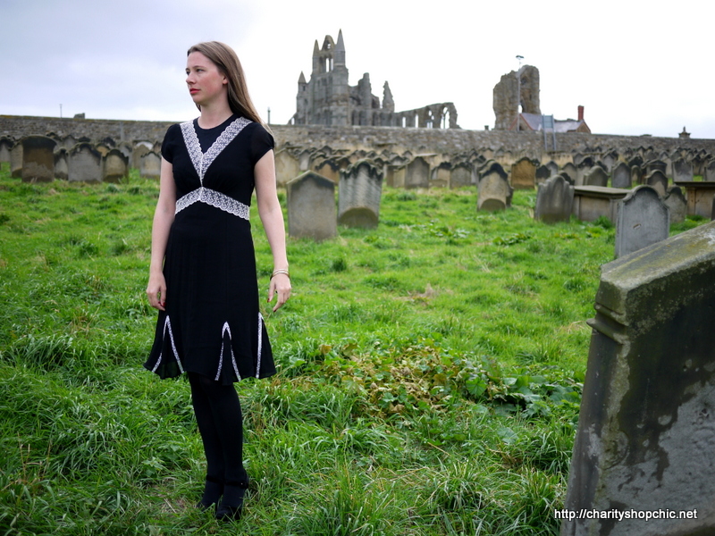 Lovely job, again! I was trying to figure out what else you did to the dress as the bodice looks so much better but suddenly realised that just wearing black underneath that lace really lifts it, and you are so right about the godets, they were way too big! The whole thing looks so much better chopped off at knee length. I think you should have a concession in “The Great Goth” shop! Thanks for the shots of lovely Whitby, I was there six weeks ago and really miss it.