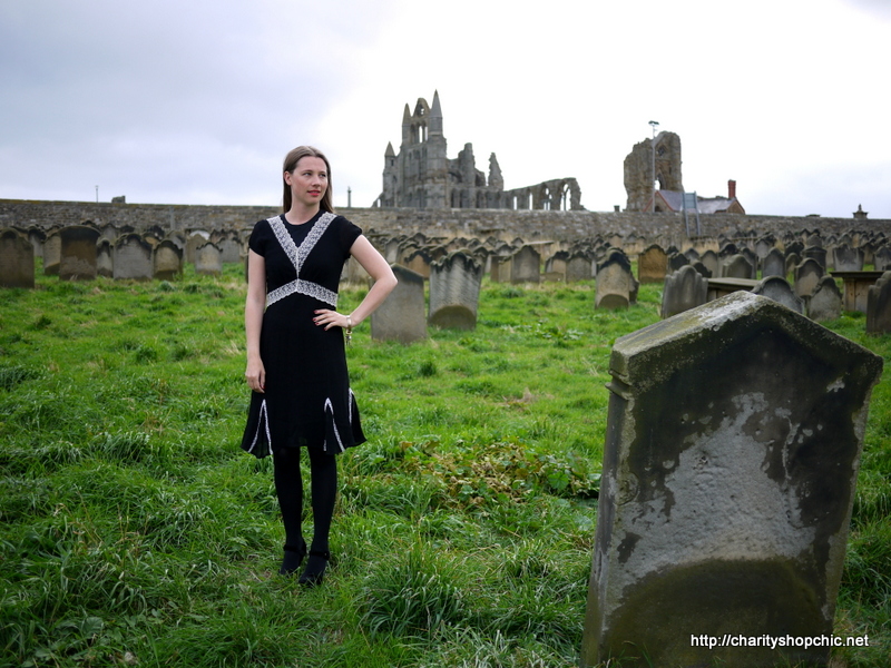 My home town (Whitby, UK) is one of the settings for Bram Stoker’s book ‘Dracula’ and has a big connection with Goth culture hosting two Goth festivals every year. It made a great backdrop for this dress! We have a rather gothic-looking ruined abbey which adds to the atmosphere no end.