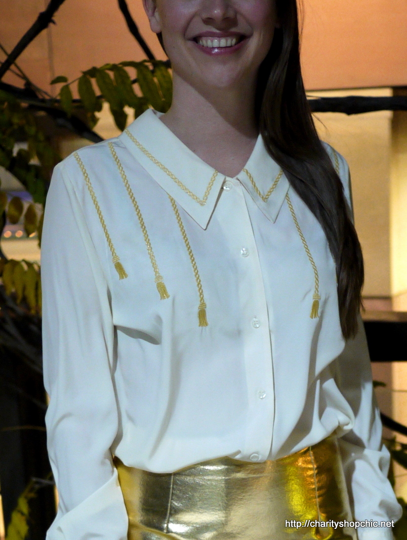 This beautiful vintage blouse has shiny gold embroidery all over it. The embroidery is in the form of a rope and tassel motif, which makes me think of the theatre, though they could just as easily be curtain tie-backs I suppose. The label says ‘Opera’ so I suppose it could have been worn to the Opera at some point! The gold thread is actually quite glittery, very eye catching. The colour of the fabric is a strong cream, definitely not white. It’s polyester, but quite heavy so it drapes well.
