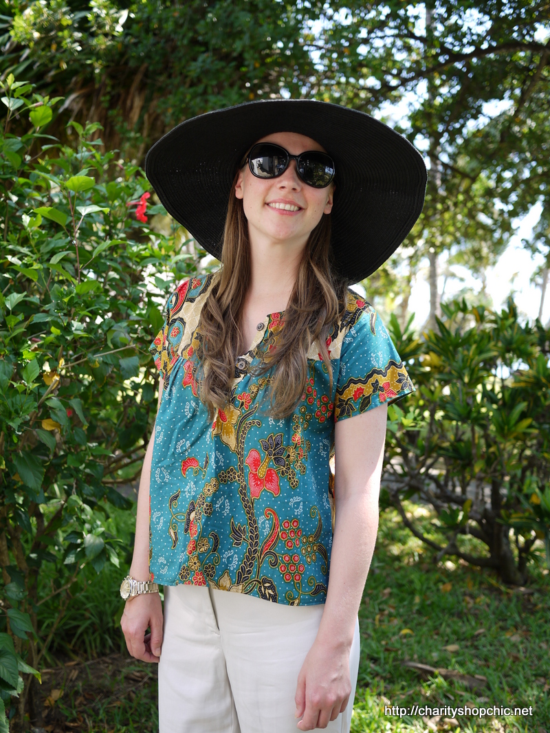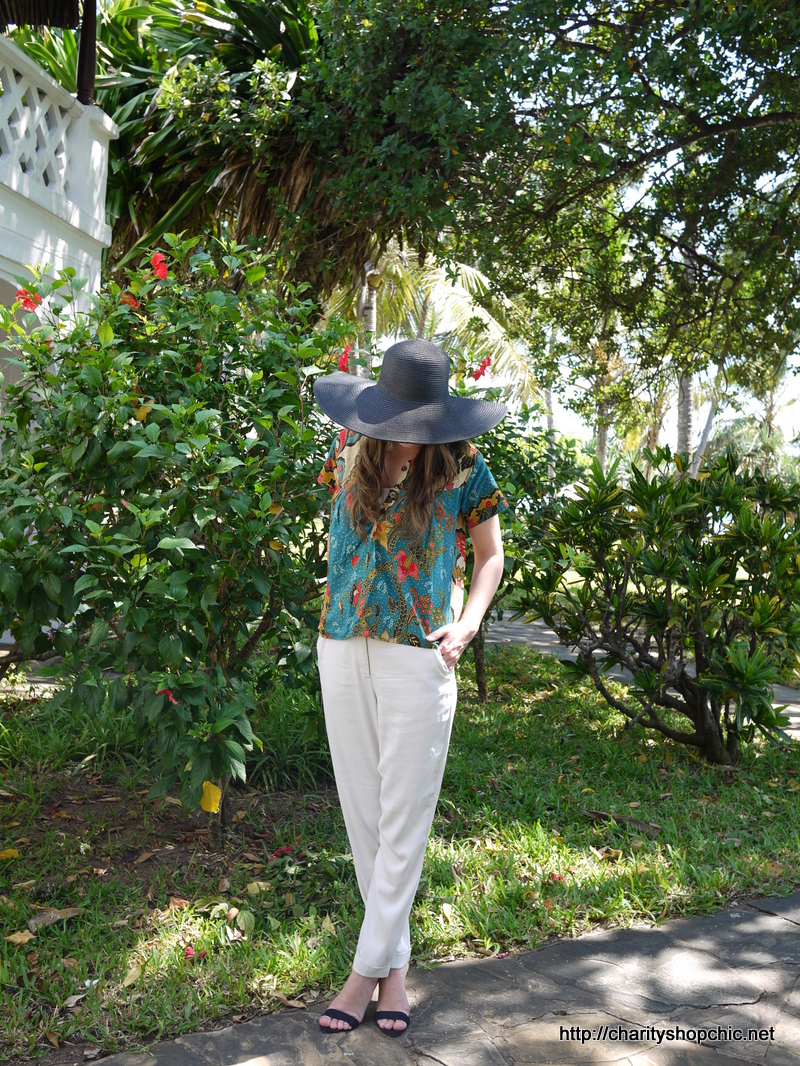 I wore the blouse on holiday with white satin cigarette trousers and sandals, with the obligatory fabulous hat. It was perfect for a sundowner at the hotel bar (minus the hat).
