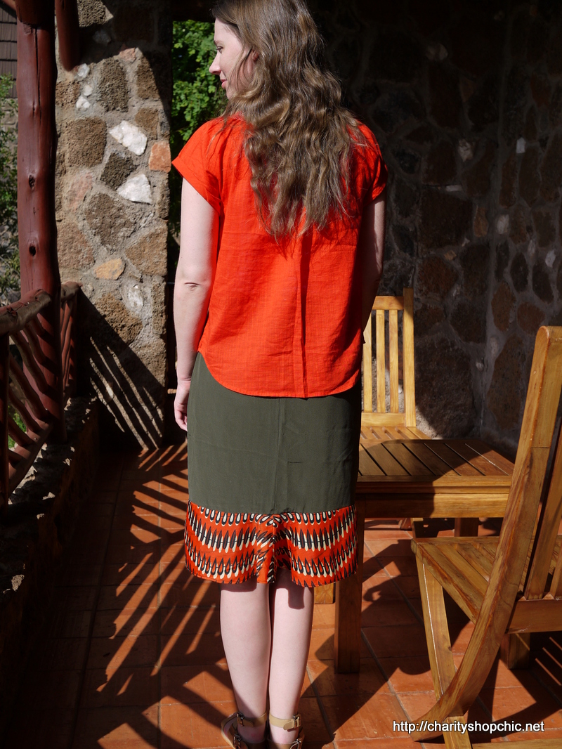 Hi, just wanted to say I love the olive skirt paired with the orange material – it really brings it to life. What camera do you have by the way? Your pictures are awesomeX