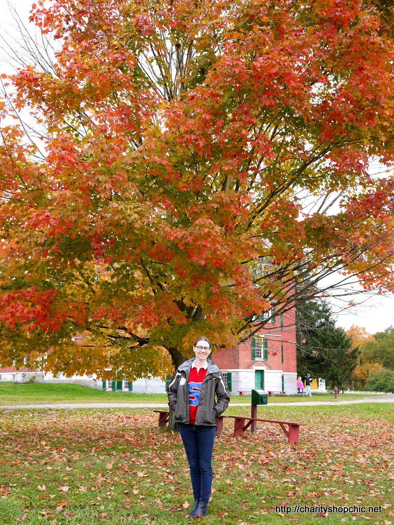 Here’s me wearing it in the US. It was snuggly warm, perfect for a cold day at Hancock Shaker Village in Western MA. In the centre of the main area is this beautiful tree.