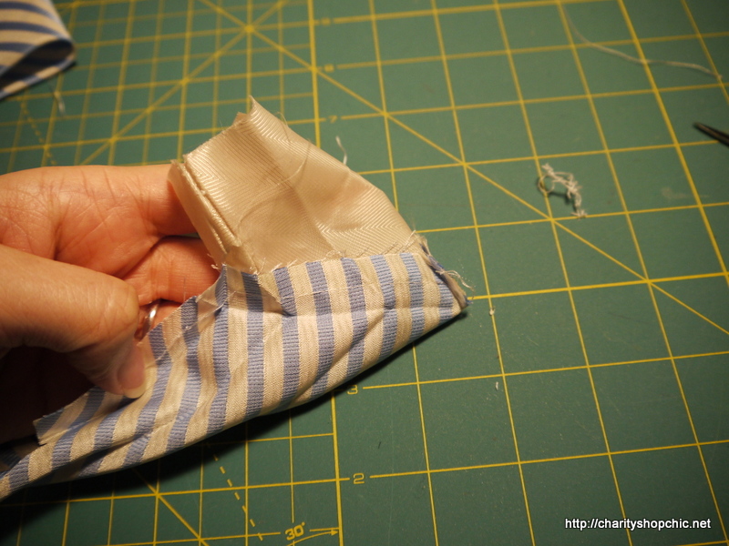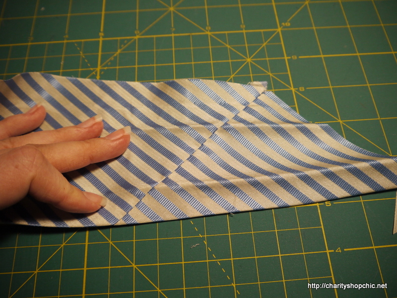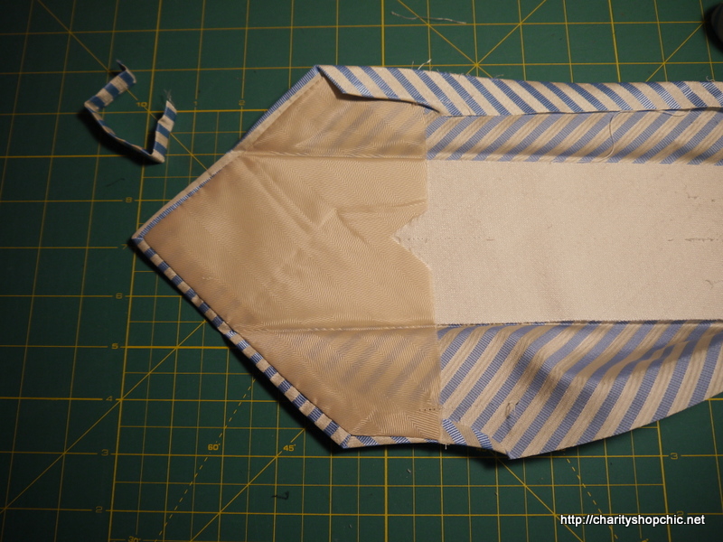 I had to cut the tie into strips (not as many, nor as thin as for the blazer), and join them together to make one long strip. Note the non-matching stripes at the join made in the factory.