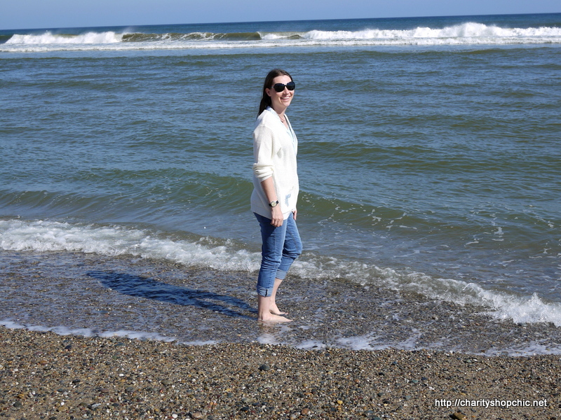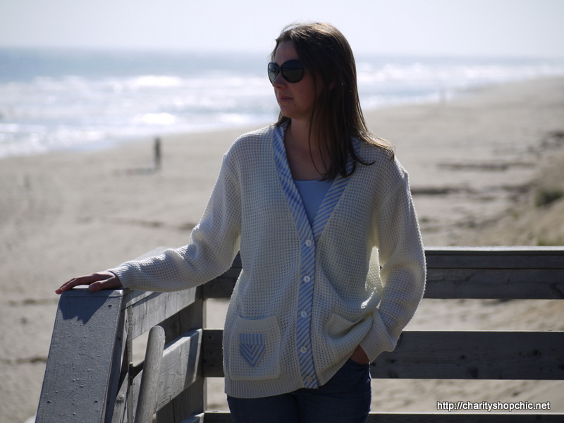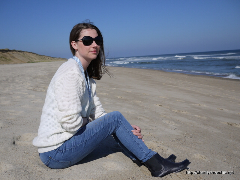 This one was intended for our trip out to the beaches of Cape Cod, so I wanted a preppy/sporty vibe. I picked up this cream cardigan in the PDSA shop in Orpington (if memory serves…) for £4.99, thinking it looked a bit like a cricket jumper. It’s actually a rather unfortunate polyester item which has clearly been treasured by an elderly lady in its former life. It’s ugly, but the fit of it isn’t too bad, if you like oversized (I do).