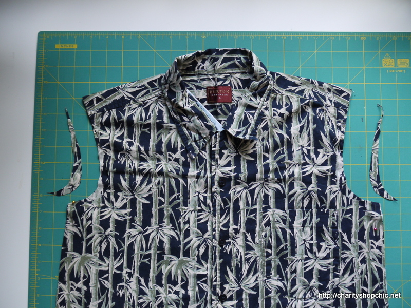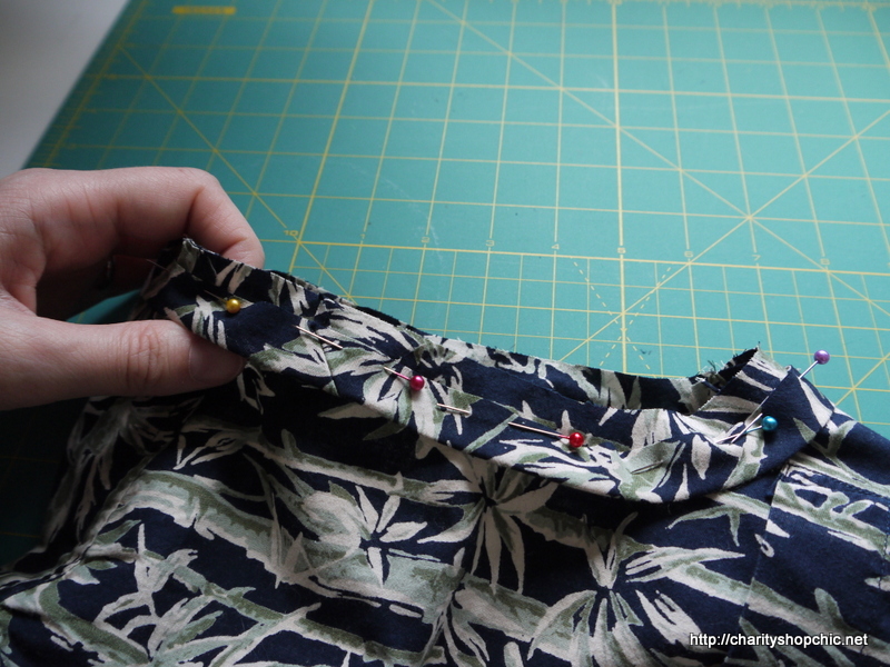 …and cut around it, trying to leave a fairly even seam allowance of 1.5 cm all around. You can see that I actually pinned it in place for more accurate cutting. I left the shoulders/yoke intact, and decided to leave the collar on to make it more like a shirt-dress, since the buttons were staying anyway.