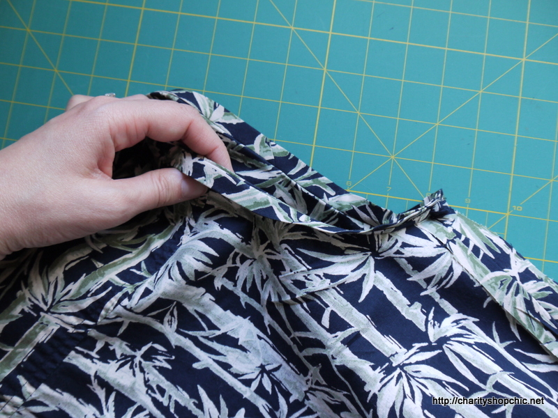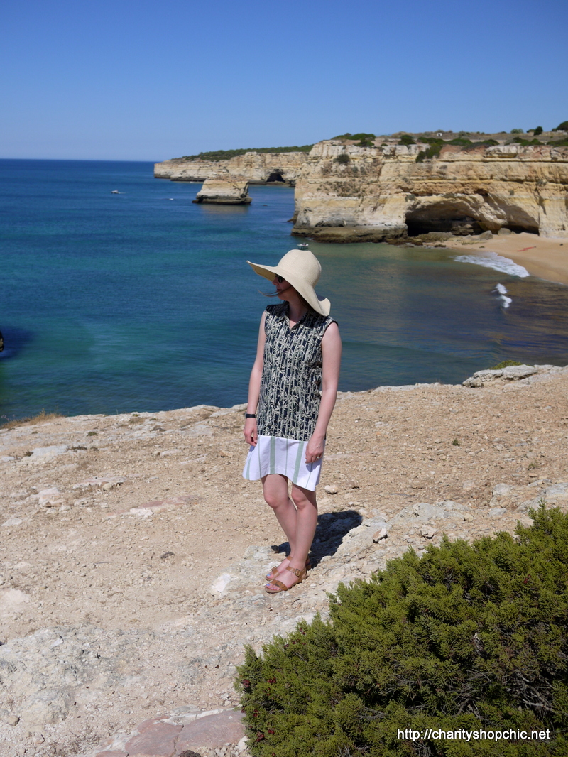 I bought this men’s cotton shirt in the Save the Children shop in Whitby for £3.49 after I fell in love with the print. At the time, I thought it was palm trees, but now that I look closer, it’s more like bamboo – it’s a green and beige print on a navy background. It’s actually not all that big, despite being a Large. Since the cotton is relatively heavy, I earmarked it for a dress, but then forgot about it for several years. With an upcoming trip to (spoiler alert) Portugal, I dug it out recently to be given a makeover as part of my holiday wardrobe.