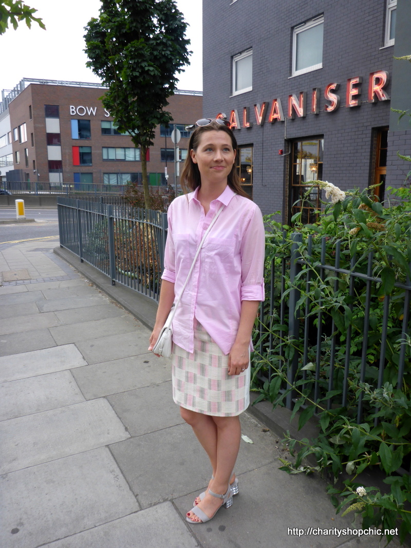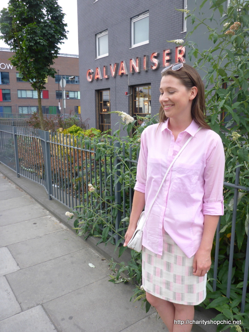 Brilliant! The combination of pink and grey is so feminine I think, and love your pink shirt and grey sandals too. I do agree with a previous commenter that it might have been too much to have the whole skirt in the same fabric so it was a win-win situation!