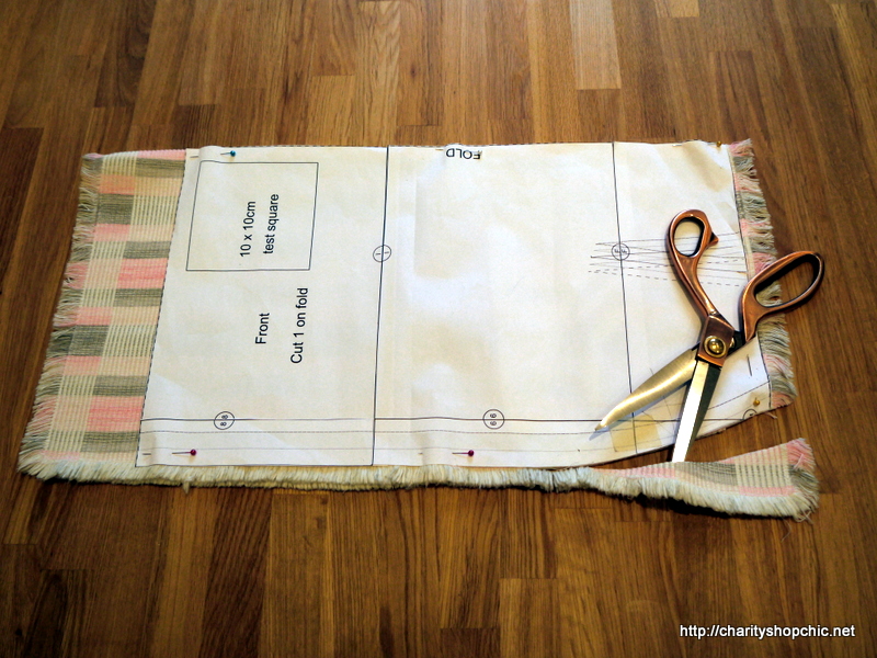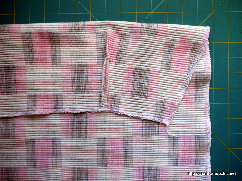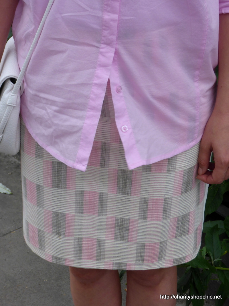 The tablecloth itself is a thick weave often used for placemats, though it’s bigger than a normal placemat, that’s why I think it’s a tablecloth, perhaps from a side table or coffee table. Anyway, I paid SEK 10:- for it (a little under £1). It caught my eye because of its pretty pink, grey and cream colour scheme, so I snapped it up (along with a few other examples of doilies and table linens, which you will be seeing here in due course). Of course, I wanted to wear it here in London – no sense wasting pretty textiles like this on homewares!