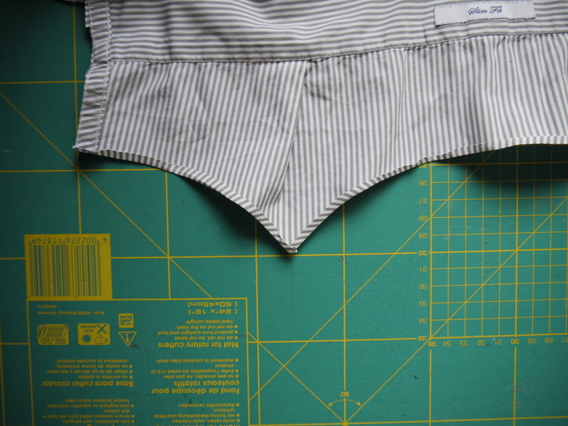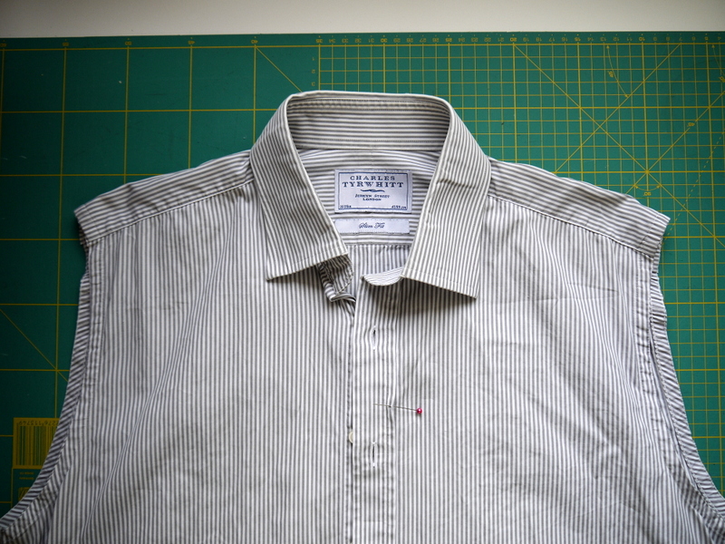 I cut the yoke from the donor (stripy shirt), leaving a pointy edge. I just cut this by eye, but I did fold the shirt over to try and make it the same on the left and right.
