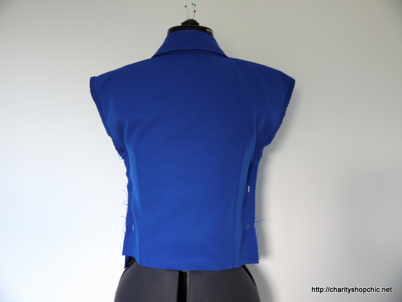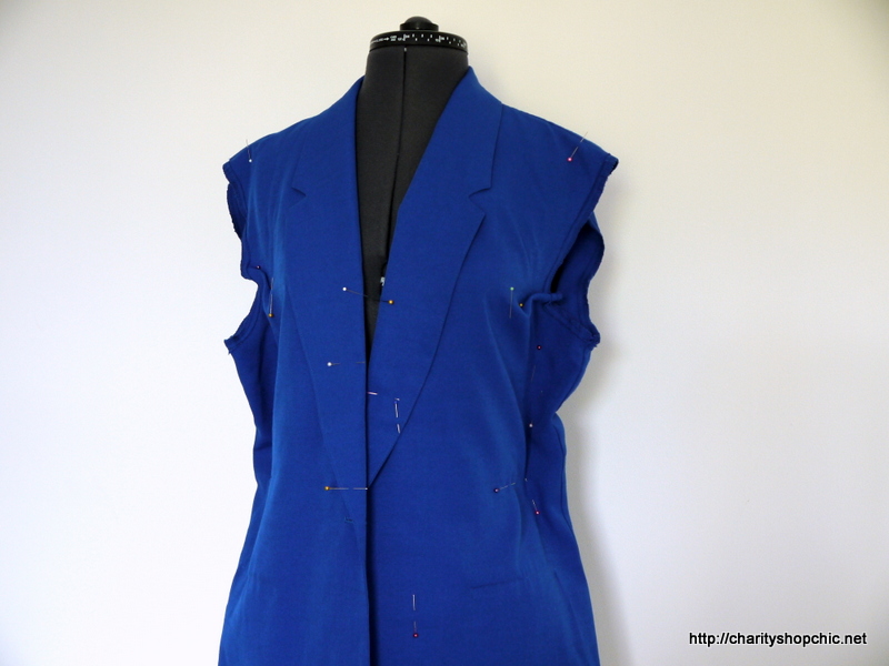 I tried it on in front of the mirror and marked the amount of overlap with pins, as well as new dart positions on the front and back, and how much to take it in on both sides. The collar/lapels were unchanged.
