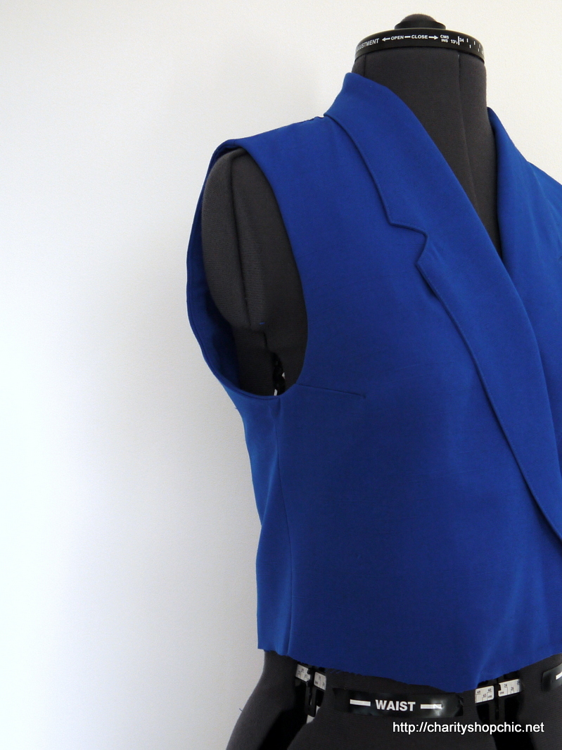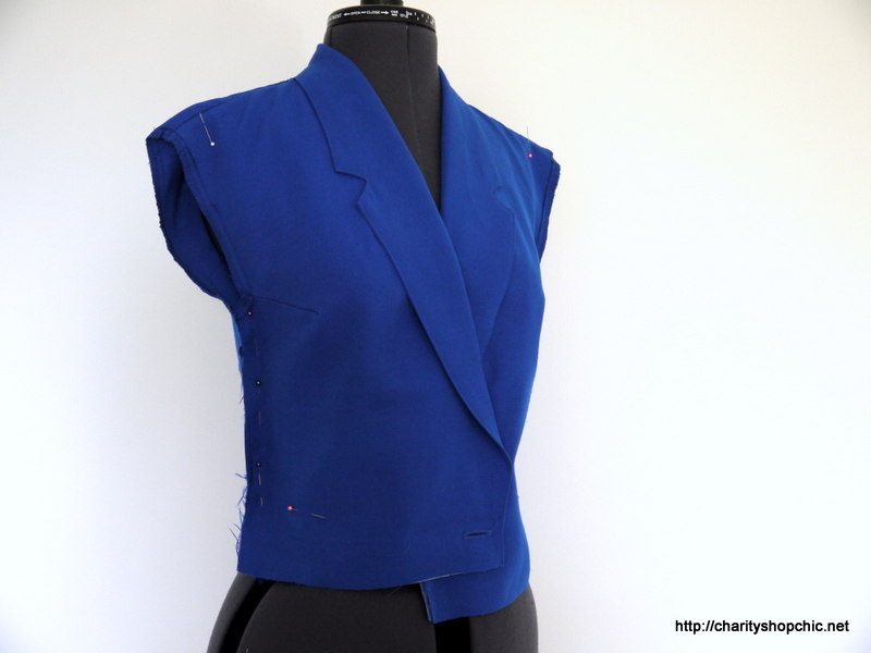 I started by removing the sleeves and I also cut off the button and the pocket flaps, playing with the overlap to see how much it could be overlapped without significantly affecting the collar roll line. I didn’t get a photo of it, but there are two darts under the collar that meet the shoulder, so I didn’t want to expose those by moving the lapels too much.