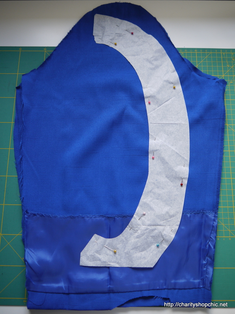 I was going to bind the edges but decided in the end to cut a pair of facings for the armholes. I had to cut these from the sleeves as they ended up being quite big. I applied fusible interfacing to the facings for stiffness. As an aside, you can also see below that there was actually a minimal amount of lining near the original cuff!