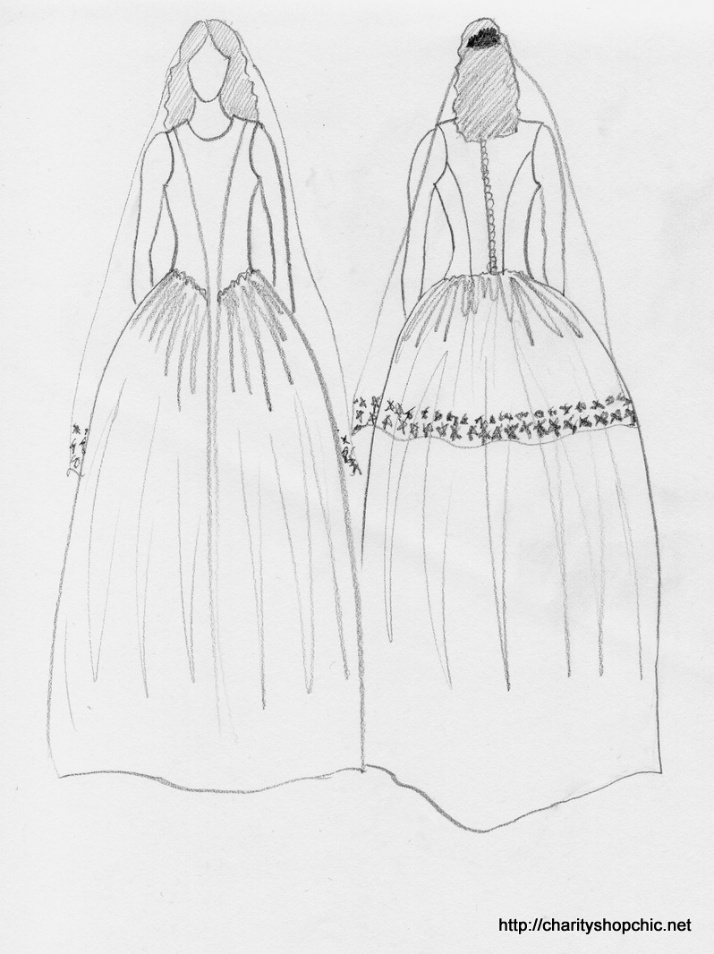 That final picture above is probably the closest to the final shape. Note the cutaway arm holes, the huge bell shaped skirt and the veil with embroidered stars on it. The v-neck and v-armholes are supposed to look like a star shape on the bodice, but it’s quite subtle.