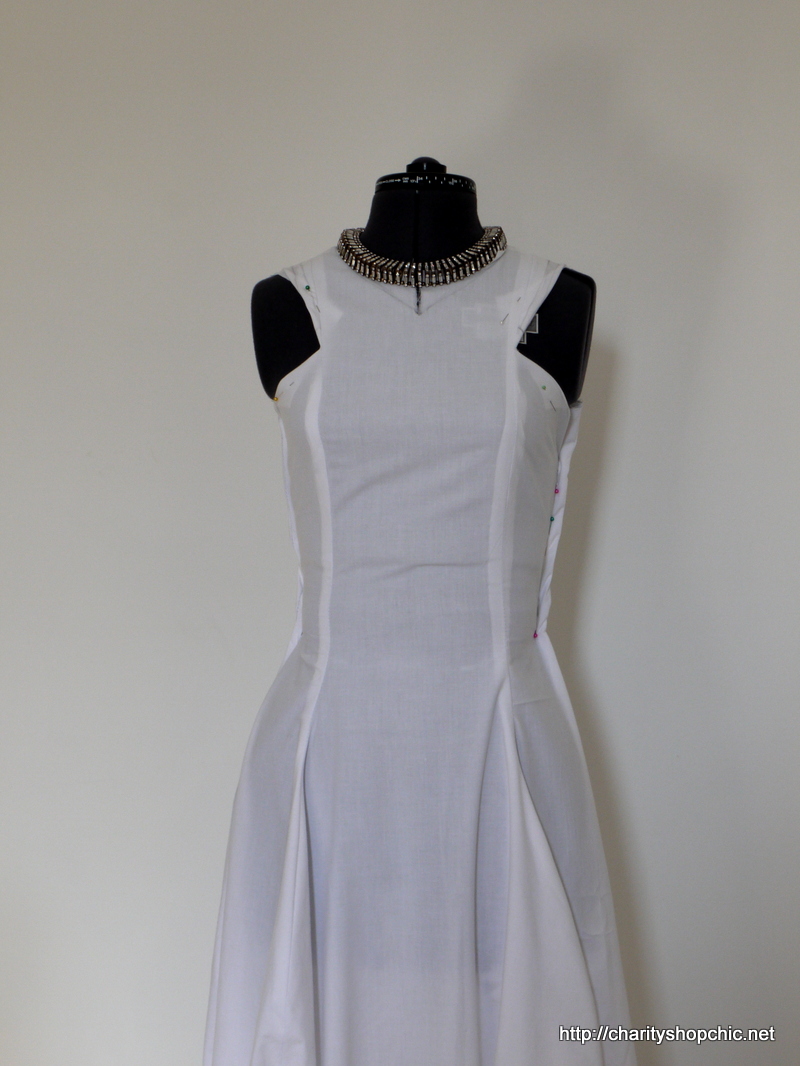 I was still toying with the idea of a rounded neckline to match the necklace at this point.