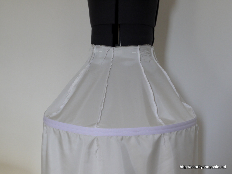 The structure of the underskirt needed a little work. I decided it was best to leave this completely separate from the dress so it could be taken on and off separately, if required. It therefore got a separate waistband (made of white grosgrain) and a bow to hold the back shut to hold its shape.
