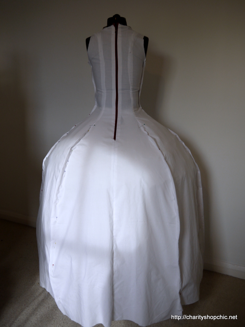 Agreed – the skirt was a bit too wide. The original pattern was drawn on paper with the skirt panel width based on a rough estimate of the final circumference of the skirt in mind. It was a balance between making the underskirt bigger and making the skirt smaller, trying to get the proportions right. So the muslin really helped!