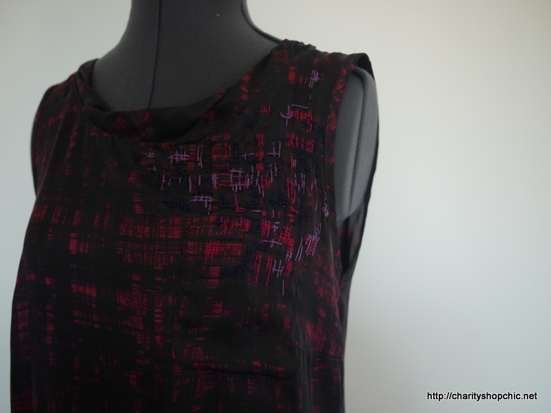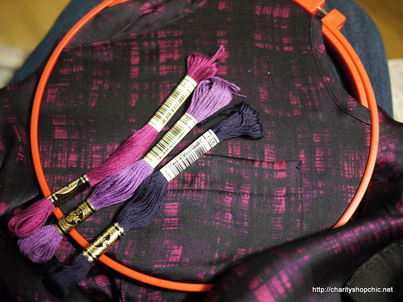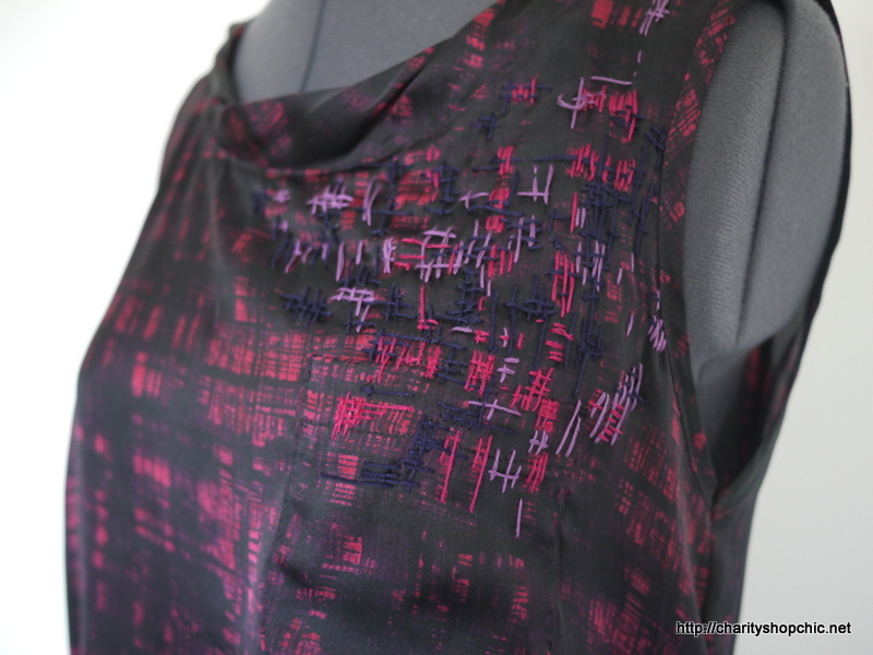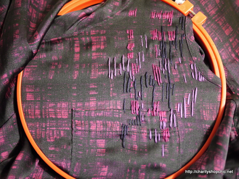 I picked up this top in Lewisham Scope (£3.50). It’s a very light poly satin, almost poly chiffon. It has an interesting neck band, which is sewn on doubled over but with the two edges off-grain, but it’s the print I wanted to investigate. It’s different shades of purple in a cross hatched, almost painted, pattern. I wanted to explore an embroidery that would complement the print and this being straight lines, it seemed like an easy place to start.