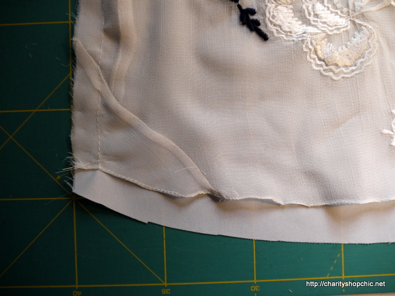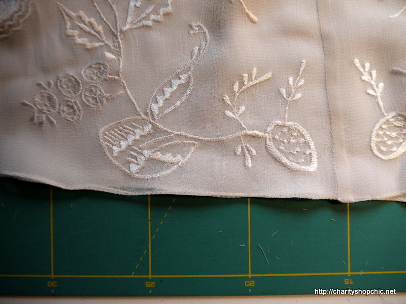 The rest of the top is made from an off white polyester I found in my stash. The embroidered panels are used as an overlay to the front, hemmed separately.