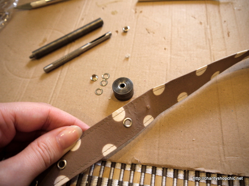 I had to add extra holes to the belt as it was too big. This was my first time using eyelets! It’s actually easier than I thought. You just mark where you want the hole, punch a hole there, insert the two pieces of the eyelet, place the assembly on the small round piece of metal, then bang the other punch down with a hammer. Et voila!