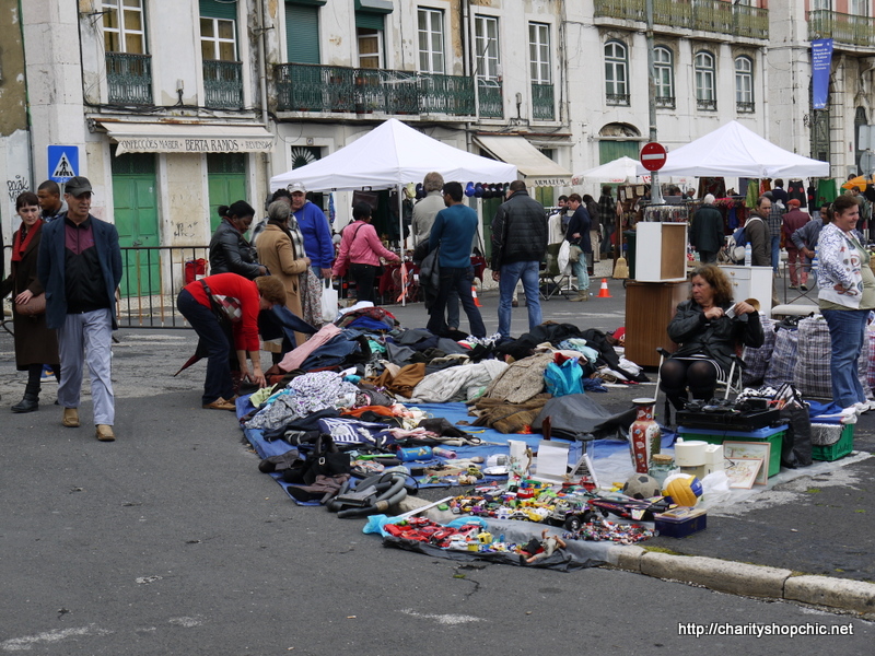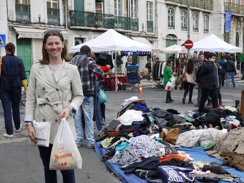 There was one stallholder with piles of old clothes, mostly your standard charity shop fare but some vintage. I had a good rummage for unusual prints and bought two pieces, including this skirt. I confess that I paid 8 Euro for both pieces (4 Euro each), mainly because I don’t speak any Portuguese so wasn’t really up to haggling with the stall holder. I only understood that it was 8 Euro because she was holding up eight fingers. So I do feel like it was a little expensive, but I had good fun rummaging so I was happy. Here is me with my purchases: