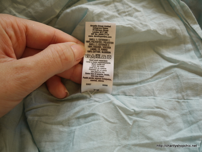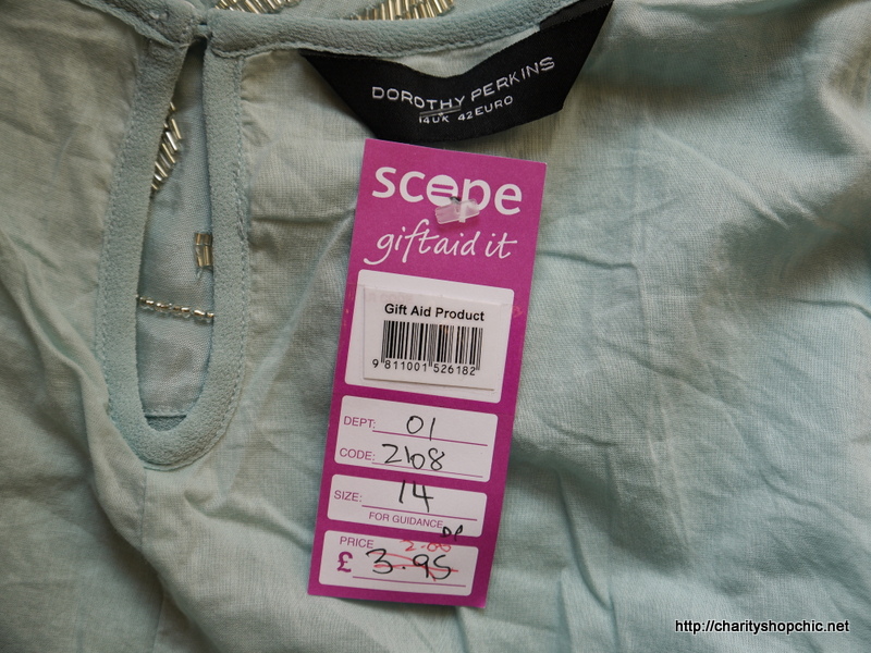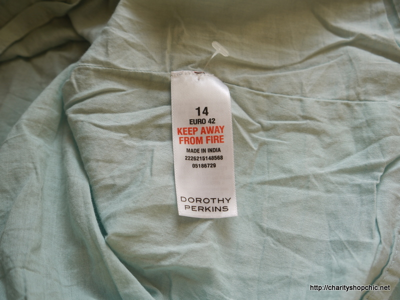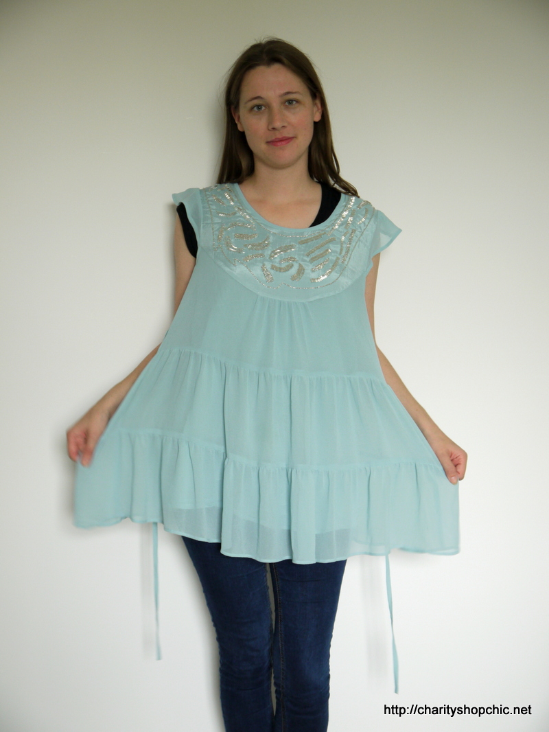 I bought this Cambridge-blue (Tiffany-blue?) polyester/viscose top in the Scope shop in Lewisham, a while back when they were having a sale. It was £2.00 (reduced from £3.95). Score!