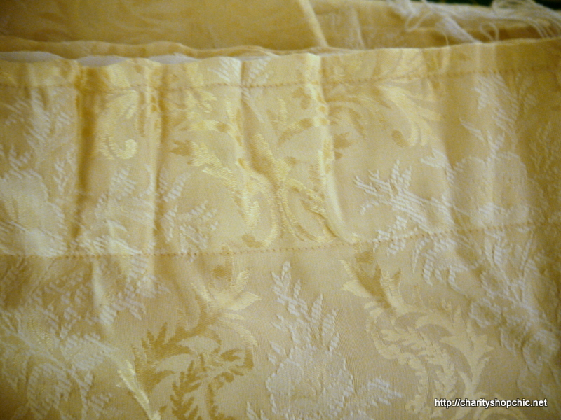I bought this curtain (singular) in the Salvation Army shop in Deptford and although I the tag is missing, I think I paid £5 for it. I’ve had this in my possession for quite some time, just waiting for the right project. It desperately wanted to be a party dress. It’s cream and white brocade, not too thick, lined with plain cream cotton.