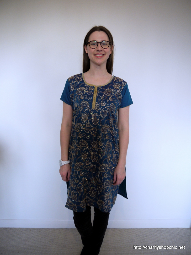 I bought this tunic top in the Human Relief Foundation shop in New Cross, and if I remember correctly, I only paid £2 for it. It’s a stunning deep teal blue silk with gold trim, heavy embroidery and rather glamorous gold sequins! It looks like it could have been the top half of a shalwar kameez, sadly though there were no matching trousers to be had.