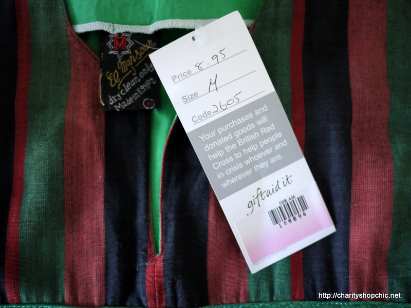 This came from the British Heart Foundation shop in Streatham and cost £6.99. The fabric has navy, white and mint green stripes with a shiny pattern in the cross weave. It’s lightweight polyester.