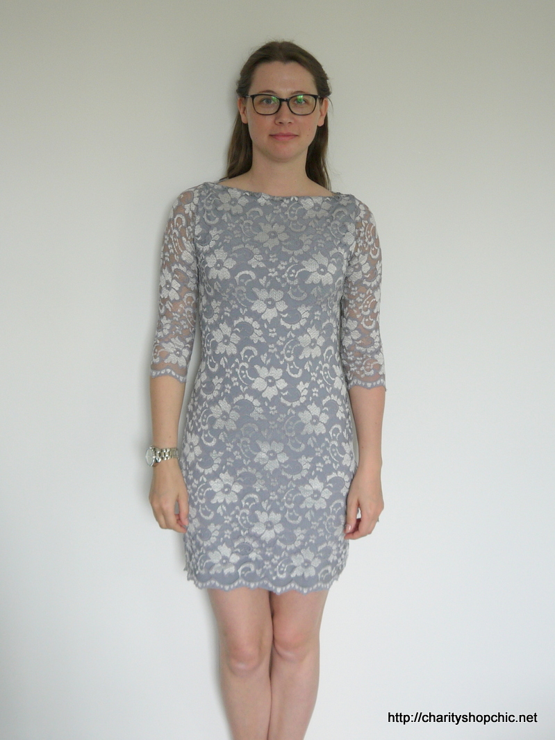 I bought this dress in the Scope shop in Whitby (£5.95) a while back; it’s silver and grey stretch lace with beautiful lace sleeves. Unfortunately when I tried it on at home, it was just too short to be wearable. The options were (1) cut the bottom part off and wear it as a weird looking top, which meant losing the scalloped edge along the hem, or (2) add something to make the skirt longer.